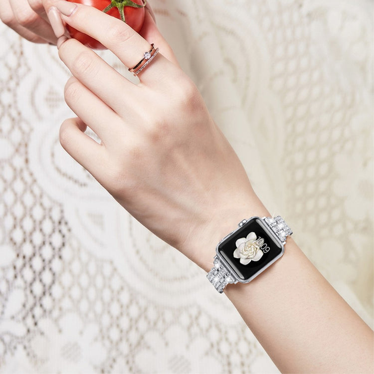 Oppgrader din Apple Watch med denne stilige og slitesterke remmen i rustfritt stål. Remmen er dekorert med glitrende rhinestener som gir klokken et unikt og personlig preg. Den er kompatibel med en rekke Apple Watch-modeller.
