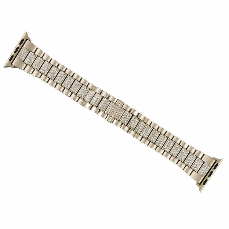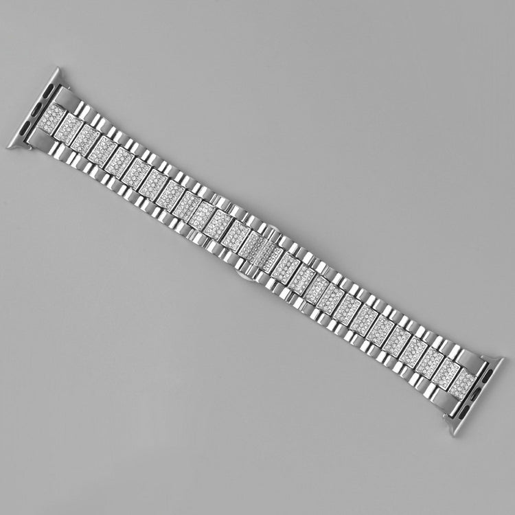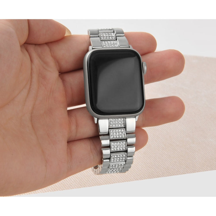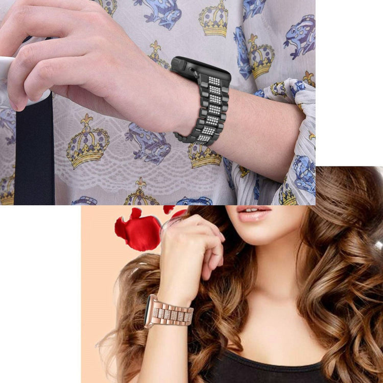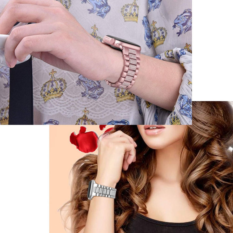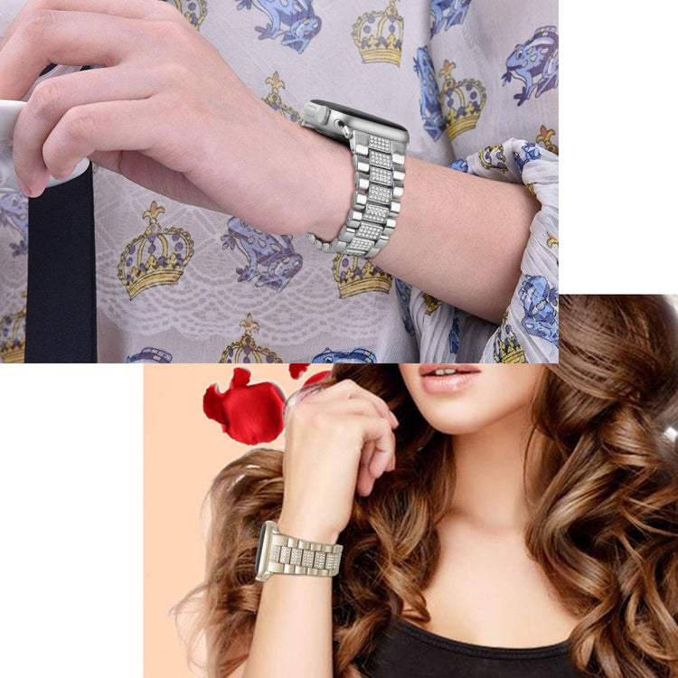 Denne elegante metallreimen er utsmykket med glitrende rhinestones og gir Apple Watch-en din et glamorøst preg. Reimen er laget av høykvalitets metall for økt holdbarhet. Den er godt polert, uten skarpe kanter, og er både vanntett og svettebestandig for optimal komfort.