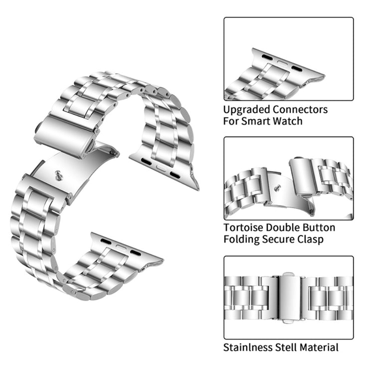 Erstatt det gamle, ødelagte klokkeremmen din med denne stilige erstatningsremmen laget av rustfritt stål, som er slitasje-resistent og holdbar. Remmen passer til ulike modeller av Apple Watch og er enkel å ta av med en praktisk spenne. Den har et moderne design som passer både til forretningsantrekk og hverdagslige anledninger, og passer for alle aldre.