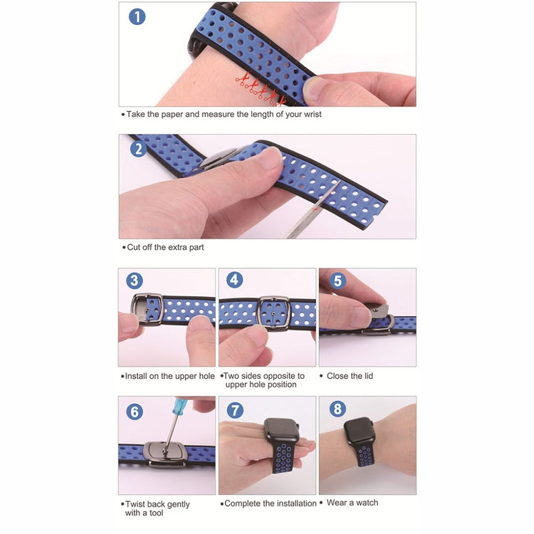 Unn deg en ny standard med vårt flerhulls silikonarmbånd til Apple Watch, som gir en behagelig og ergonomisk passform. Dette armbåndet kan enkelt justeres ved å kutte av overflødig lengde, og har et design med flere hull for enkel size-tilpasning. Ideelt som en erstatning for ditt gamle eller ødelagte armbånd, laget av slitesterk silikon for langvarig bruk.
