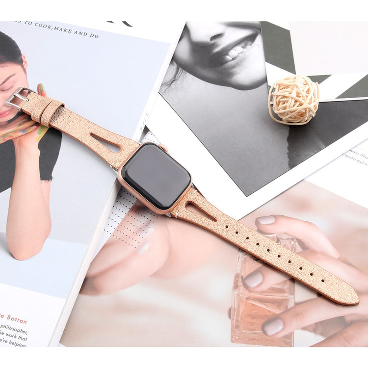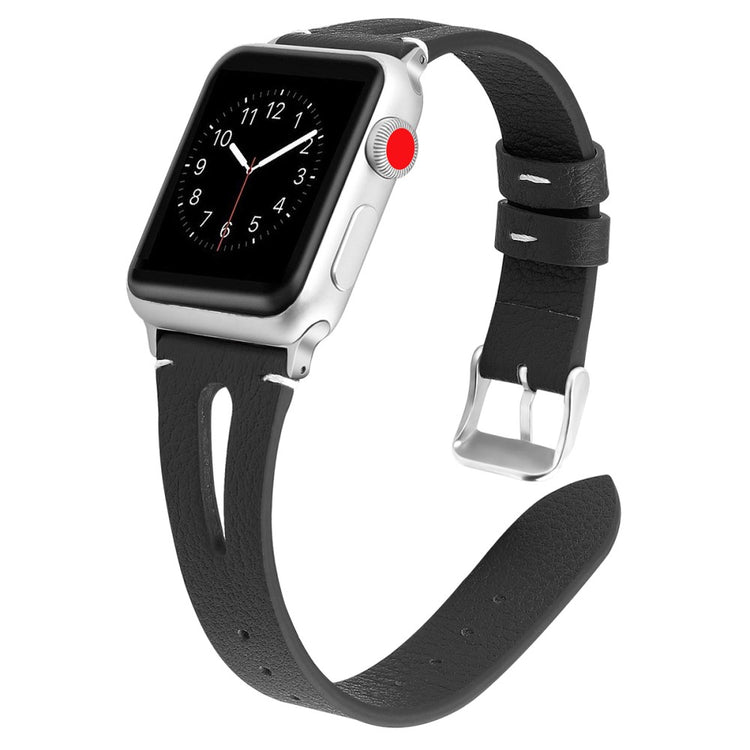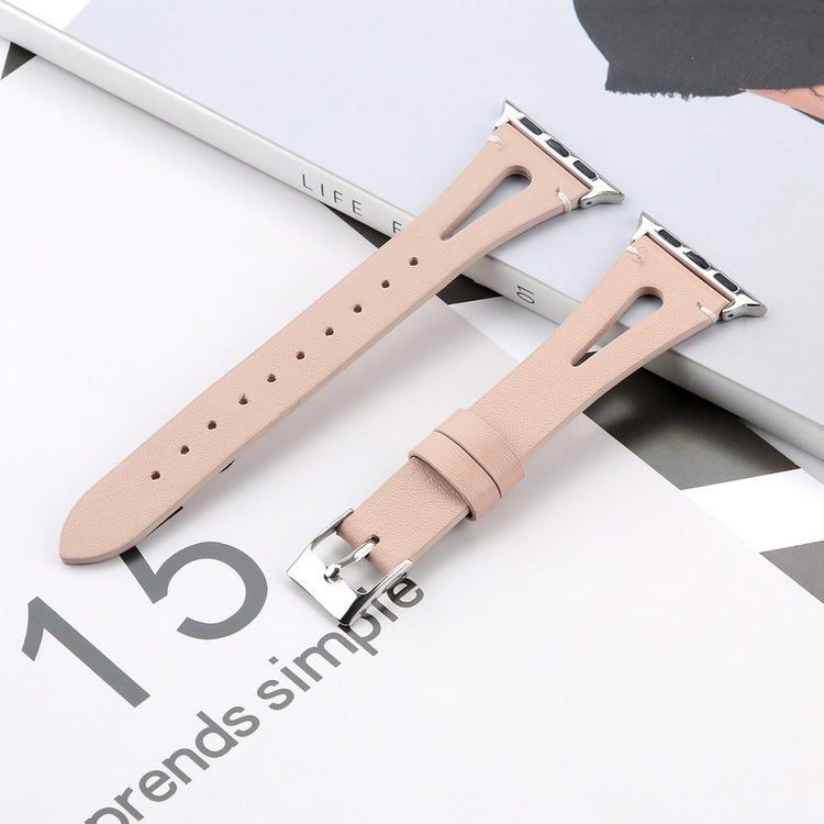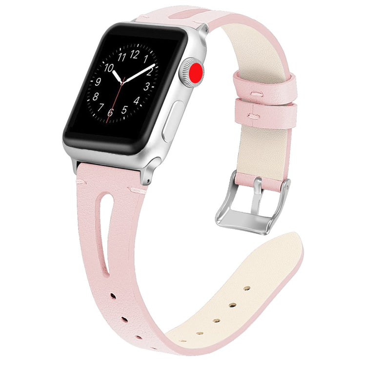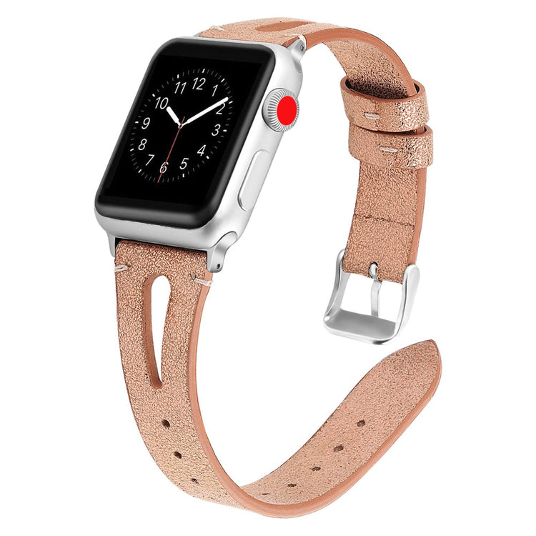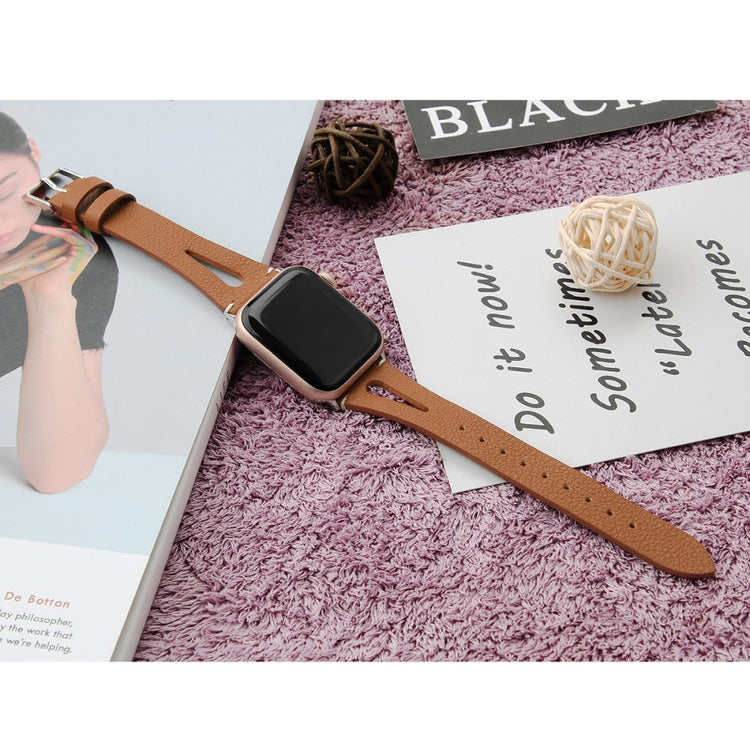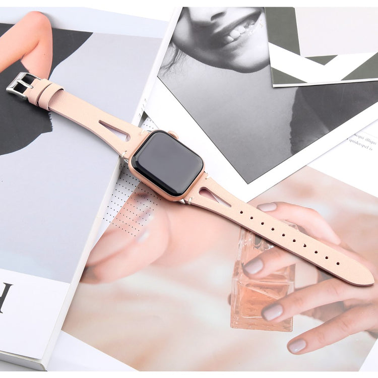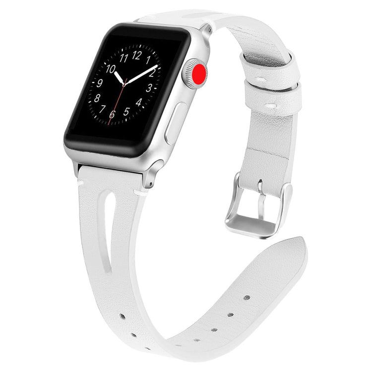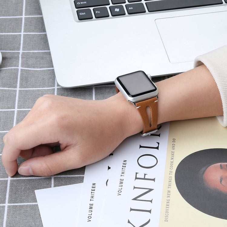 Oppgrader stilen din med vårt ekte ku skinn klokkerem med utskjæringer, spesielt designet for Apple Watch. Denne elegante remmen er både lettvekts og myk, noe som gjør at du nesten glemmer at du har den på deg. Den fleksible passformen gjør at den passer håndleddet til både små og store håndledd, fra 5.5 til 7.8 tommer, og gir en perfekt komfort hele dagen. Installasjonen er enkel takket være den høy-kvalitets rustfrie stål koblingen, som fungerer sømløst med den originale iWatch. Med en vekt på bare 17g er denne remmen en uslåelig kombinasjon av stil og funksjonalitet. Gi din Apple Watch et nytt og luksuriøst utseende med vår klokkerem i kvalitetsku skinn!