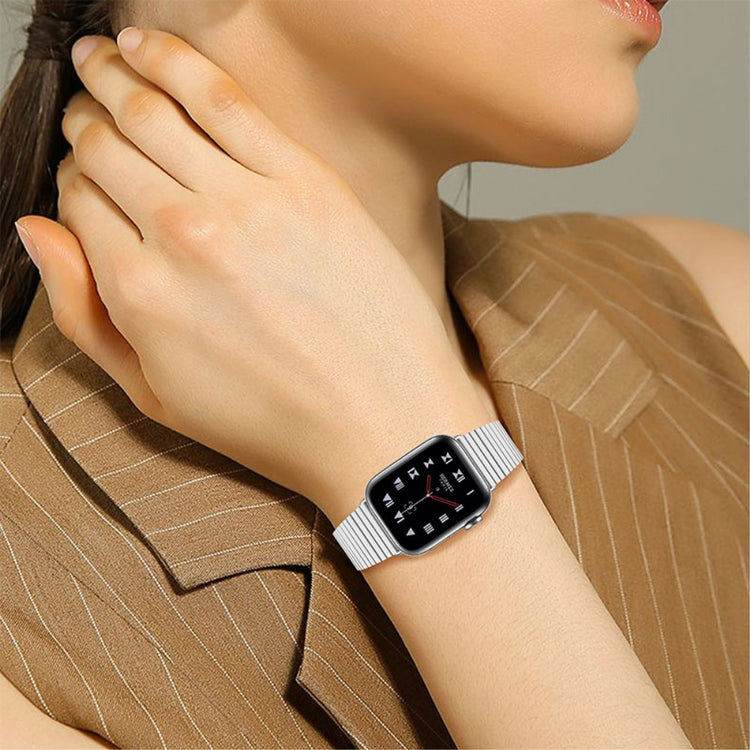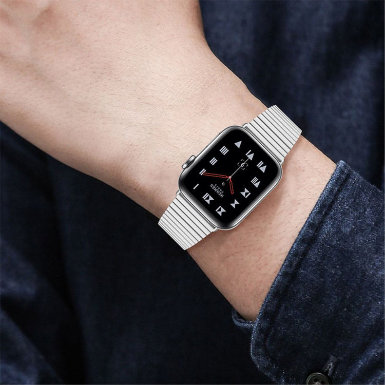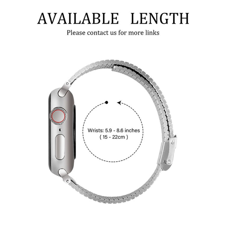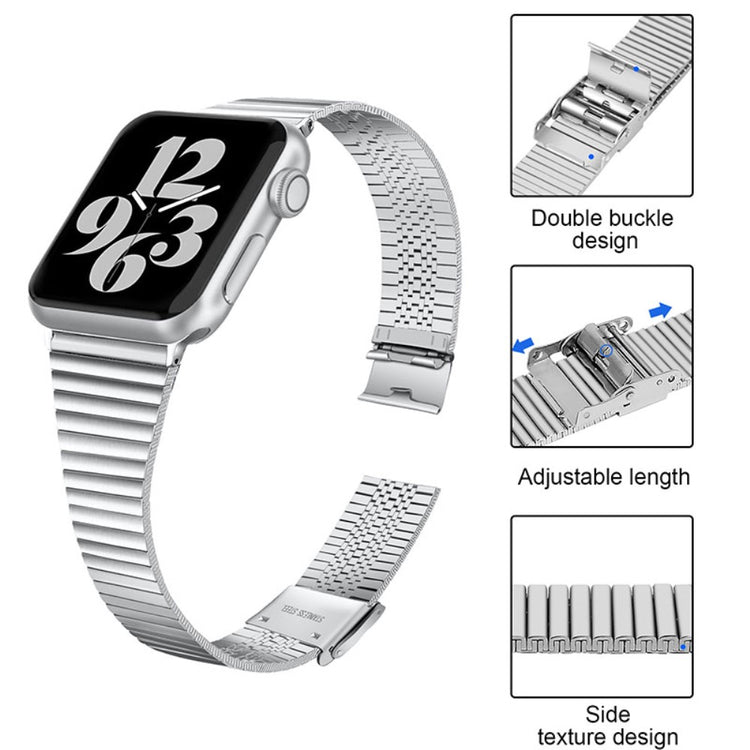 Erstatt med dette side teksturerte armbandet i rustfritt stål, perfekt for Apple Watch-seriene. Den dobbelt spennedesignen gjør det enkelt å justere størrelsen, og det enkle utseendet passer til enhver anledning. Ideelt for å erstatte ditt gamle eller ødelagte armbånd, med en omkrets for håndleddet fra 15 til 22 cm.