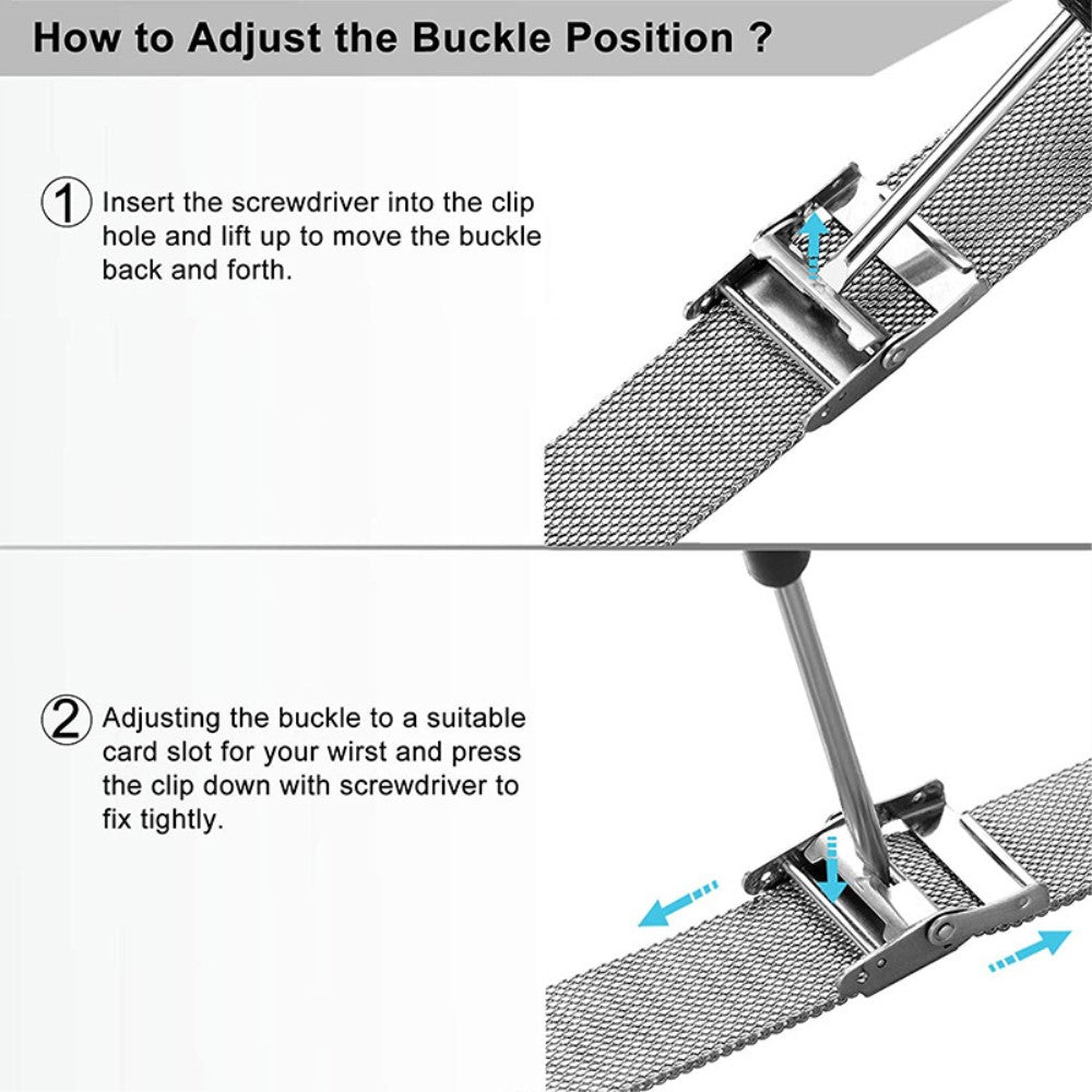 Denne stilige klokkenremmen i rustfritt stål gir en komfortabel brukeropplevelse. Lengden kan justeres, og passer de fleste håndledd. Det pustende nettingdesignet hindrer svette.