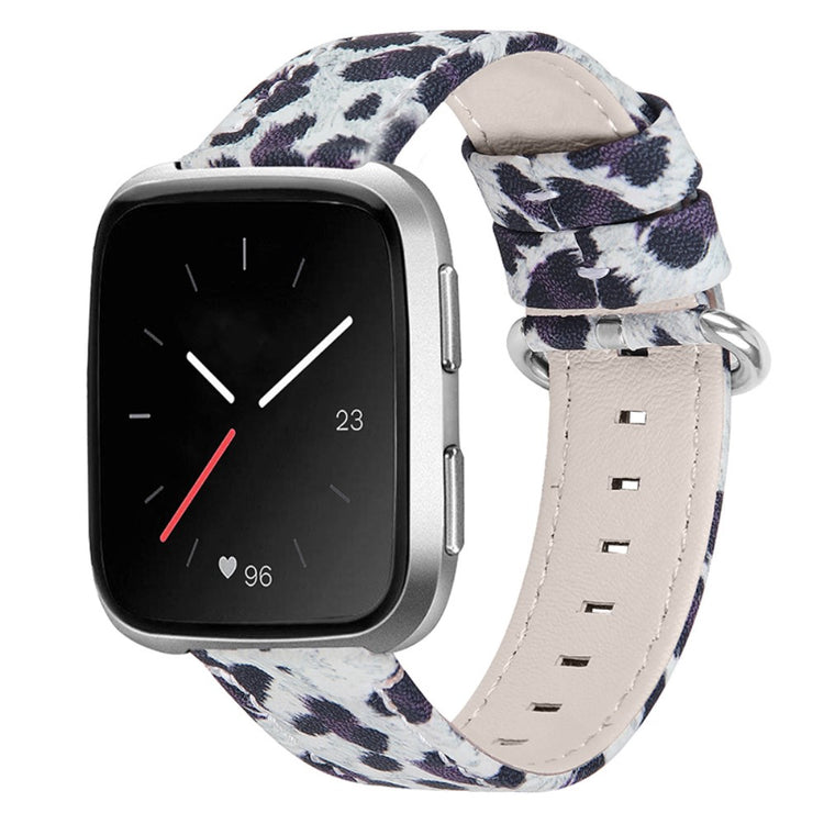 Erstatningsrem laget av kuskin med leopardtekstur, designet for langvarig bruk. Den kommer med en fås i rustfritt stål for enkel påkledning og avkledning, samt justerbare hull for tilpasning til håndleddsstørrelse. Passer til Fitbit Versa, Fitbit Versa 2, Fitbit Versa Lite, og Fitbit Versa SE.