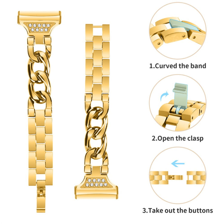 Utforsk muligheten til å oppgradere din smartklokke med vår Metallrem for Fitbit Versa 4 / Sense 2. Denne luksuriøse klokkereimen er laget av høy-kvalitets metallmateriale som sikrer både holdbarhet og eleganse. Den unike rhinestone-dekorasjonen på koblingen tilfører et glitrende preg som gjør remmen til et sant blikkfang. Med sin tidløse og glamorøse stil passer denne remmen perfekt til enhver anledning, enten det er bryllup, bursdag, Valentinsdag eller morsdag. Den er et fantastisk gavevalg til venninner eller kjæresten, og vil garantert imponere. Remmen passer til håndleddsstørrelser mellom 5.5"-8.0" (140mm-203mm), noe som gjør den universelt tilgjengelig for de fleste. Velg en stilig og funksjonell alternativrem, og la stilen din skinne!