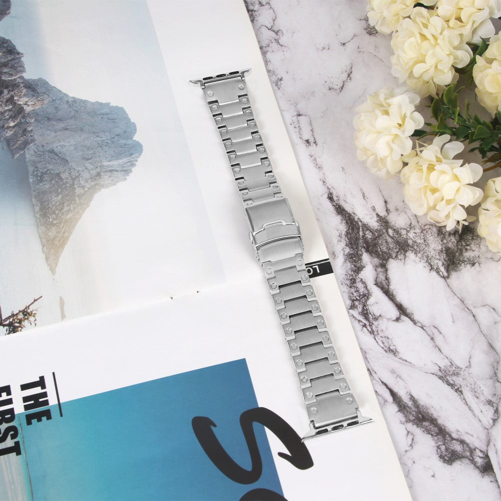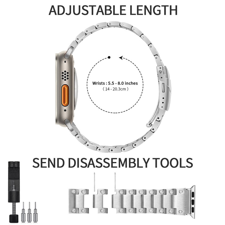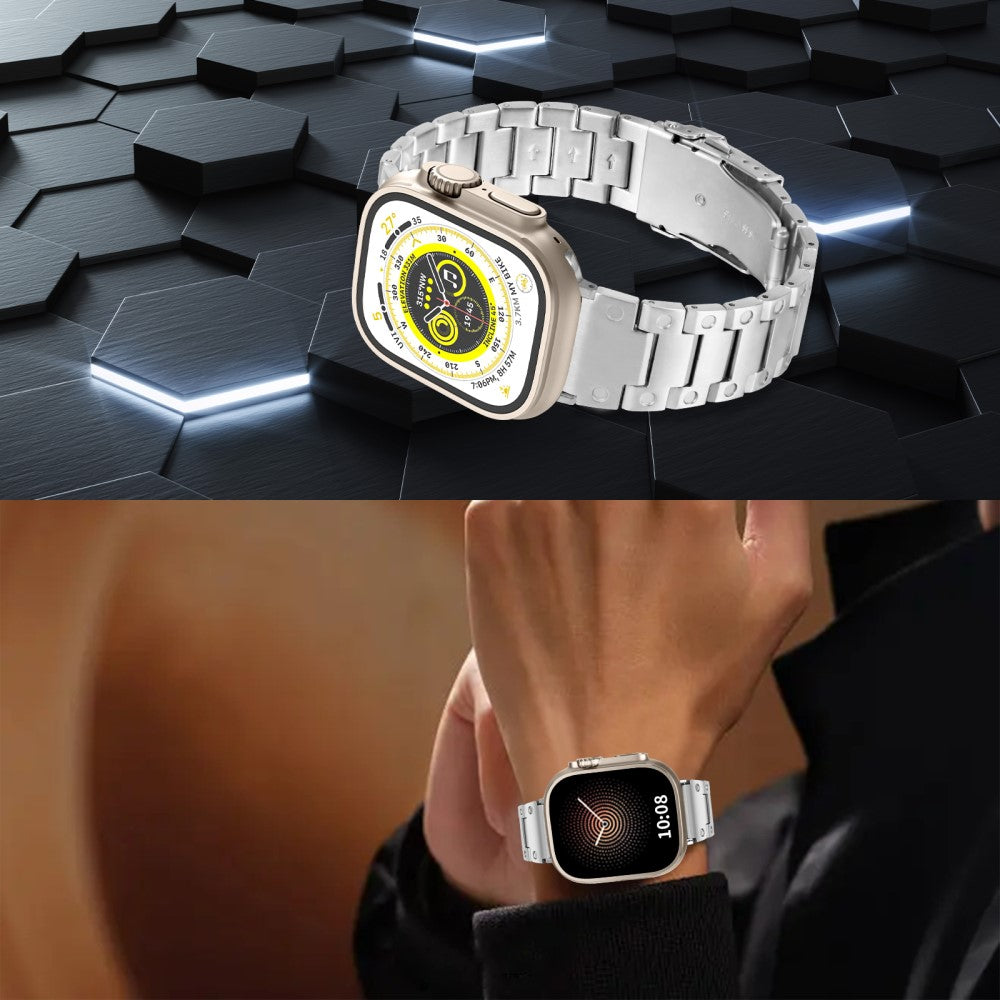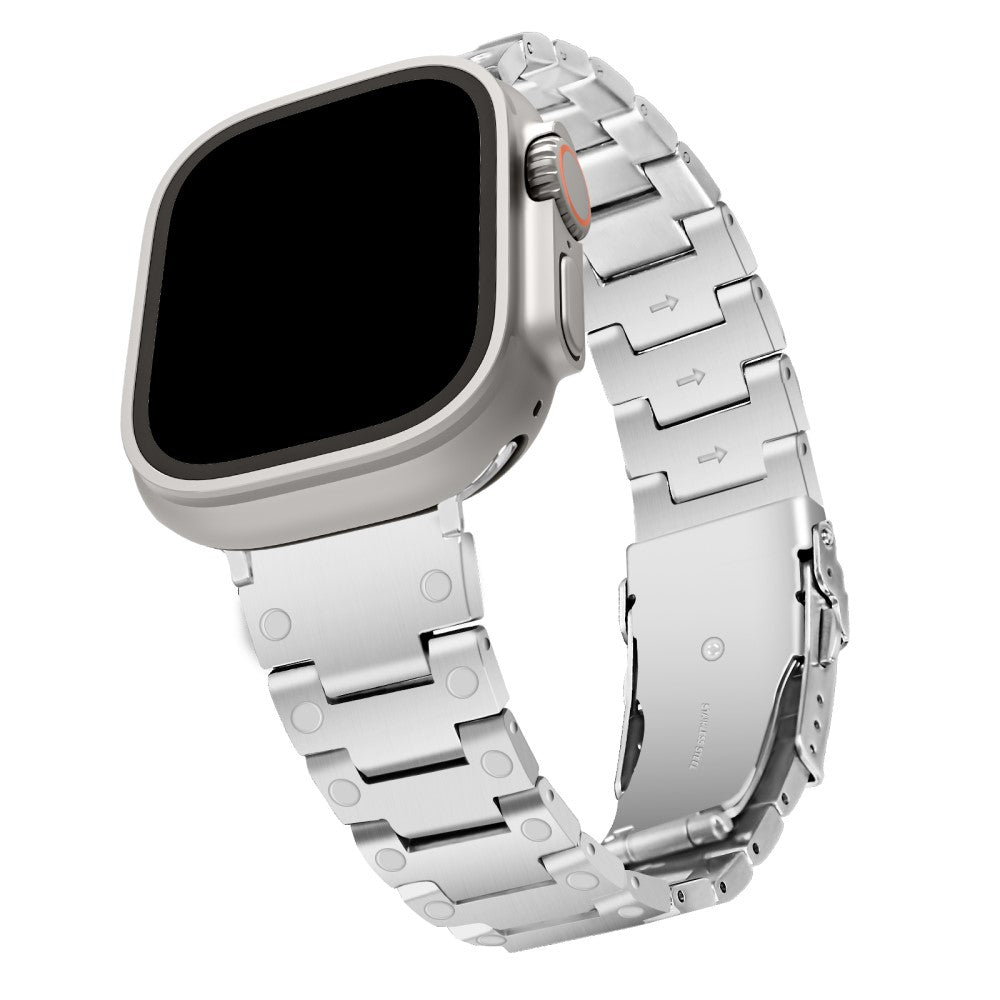 Er du på utkikk etter en oppgradering til din Apple Watch? Dette stilige klokkeremmen i rustfritt stål er designet for å passe til alle modeller fra Series 1 til Series 9. Med sitt høyholdige 316 rustfrie stålmateriale er dette båndet både eksklusivt og holdbart, slik at du kan bruke det dag etter dag uten bekymringer. Den fleksible størrelsen kan enkelt justeres for å passe rundt håndleddet ditt, fra 14-20,3 cm, og den spesialdesignede spennen gjør det enkelt å ta det på og av. Dette er den perfekte erstatningen for din gamle, slitte klokkerem, og gir et elegant preg til enhver anledning. Velg dette klokkeremmen for å gi din klokke et friskt og moderne utseende!