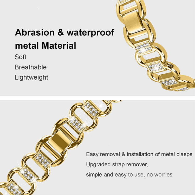 Dette klokkeremmen er laget av høyverdig metall som er nøye polert, motstandsdyktig mot svette, og både slitesterk og komfortabel. Den stilige og elegante rhinestone-dekorasjonen gjør deg til fokuspunktet på enhver anledning. Et ideelt klokkerem bytte for den gamle, defekte, med flere fargealternativer for å møte ulike stilbehov.