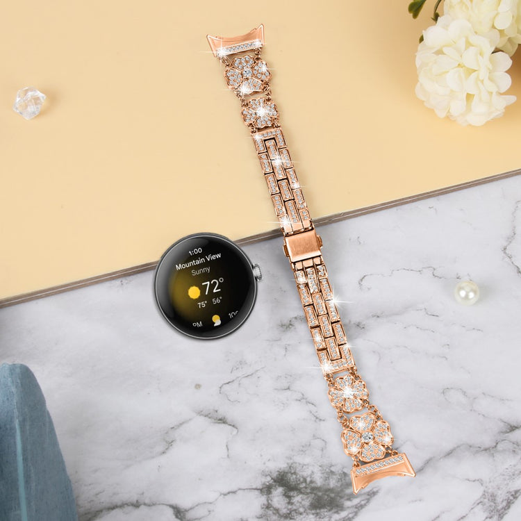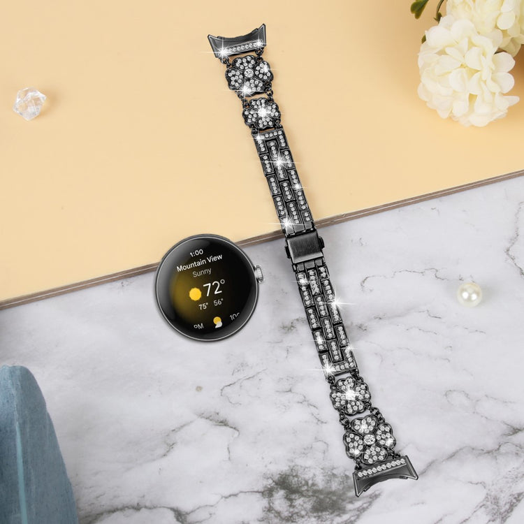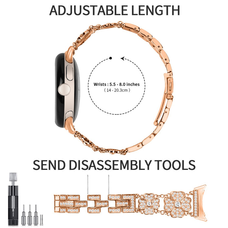 Oppgrader din Google Pixel Watch 2 med vår erstatningsrem i stål med dekorative rhinestones i form av firkløver. Denne remmen er laget av kvalitetsstål, noe som gjør den både holdbar og robust. De skinnende rhinestone-detaljene gir et unikt og stilig preg, som gjør at du kan personifisere din smartklokke på en elegant måte. Montering av remmen er enkel, slik at du raskt kan fornye klokken din. Vi har lagt stor vekt på hver eneste detalj i produksjonsprosessen, både når det gjelder håndverk, design og estetikk. Dette gjør remmen til et ideelt valg som erstatning for din gamle eller defekte rem. Den passer håndleddsomkrets på 5,5 til 8,0 tommer, og gir en perfekt passform for de fleste. Velg denne remmen for å tilføre et snev av glamour til din smartklokke!