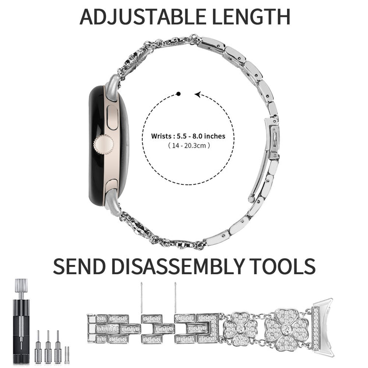 Laget av kvalitetsstål, et materiale som er både slitesterkt og robust. Med glitrende strassdekor i form av et firkløver gir denne reimen et unikt og stilig preg, og lar deg personalisere din smartklokke.