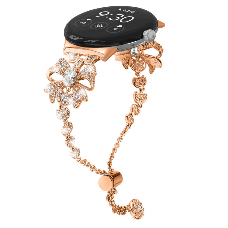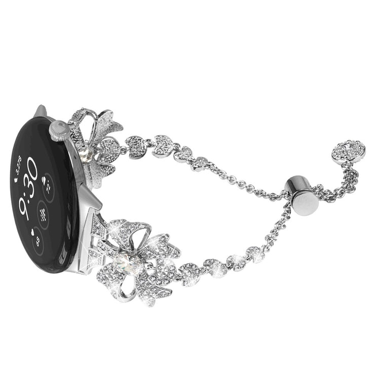 Gi din Google Pixel Watch 2 / Pixel Watch et elegant og raffinert utseende med denne lekre klokkereimen i rustfritt stål. Med glitrende strass-dekor og en feminin sløyfe, vil denne reimen garantert tiltrekke seg oppmerksomhet.