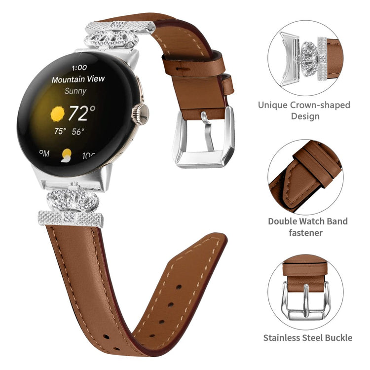 Dette armbåndet er laget av høy kvalitet ekte storfelleder, som gjør det behagelig å ha på seg og lett å kombinere med ditt daglige antrekk. Den elegante kroneformede tilkoblingen og den glitrende rhinestone-dekorasjonen gir smartklokken din et vakkert og stilfullt utseende. Med et flere hull-design er remmen enkel å justere i størrelse, og den slitesterke rustfrie stålspennen gir ekstra holdbarhet.