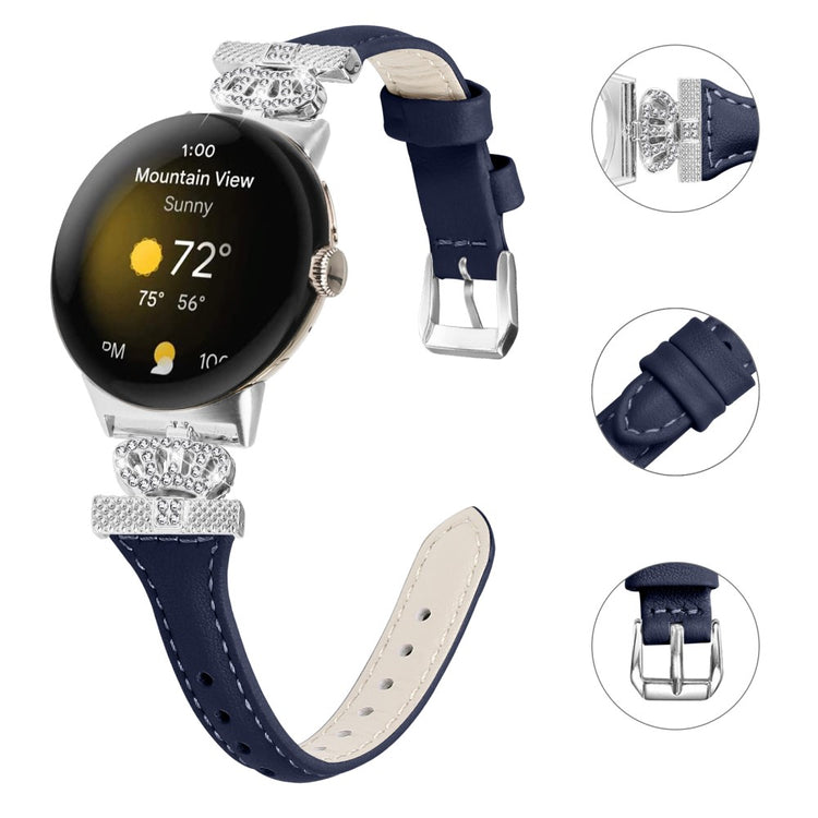 Oppgrader ditt smartsmykke med vårt armbånd i ekte ku skinn til Google Pixel Watch / Watch 2. Dette armbåndet er laget av høykvalitets ekte ku skinn, noe som gjør det komfortabelt å ha på seg hele dagen, og det er enkelt å kombinere med ditt daglige antrekk. Den elegante kroneformede festet og glitrende rhinestenerne gir et stilfullt og vakkert preg til klokken din. Med et multihullsdesign kan armbåndet enkelt justeres til din ønskede størrelse, noe som gir optimal komfort. Den høykvalitet rustfrie stålspennen sikrer at armbåndet er holdbart og slitesterkt. Dette armbåndet er en ideell erstatning for ditt gamle eller ødelagte armbånd, og det passer perfekt til både arbeid, fritid og andre daglige anledninger for både kvinner og menn. Gjør ditt smartsmykke mer personlig og elegant med dette stilige armbåndet!