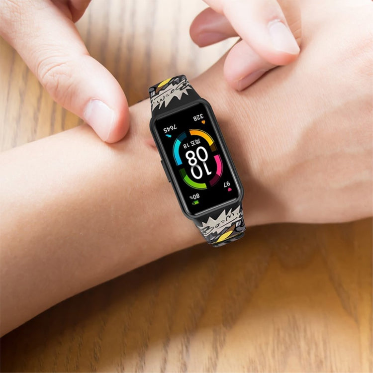 Oppgrader din Huawei Band 6 / Honor Band 6 med denne stilige og komfortable silikonreimen. Laget av slitesterk silikon, er denne reimen vanntett og svettebestandig, perfekt for en aktiv livsstil. Det trykte designet gir klokken din et unikt preg.