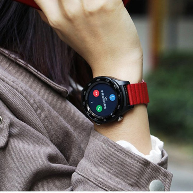 Erstatt ditt gamle armbånd med dette kvalitetsleddet armbåndet laget av ekte lær, som gir moderat mykhet og komfortabel passform. Den praktiske magnetlåsen gjør det enkelt å feste og låse armbåndet på håndleddet. Passer til flere modeller, inkludert Samsung Galaxy Gear S3 og Huawei Watch GT.