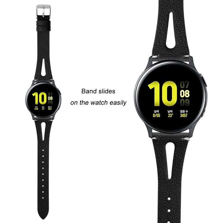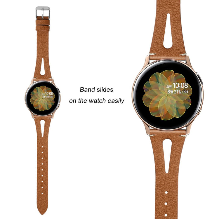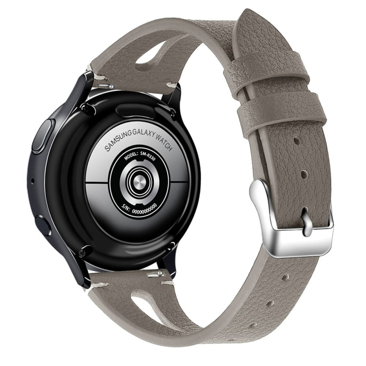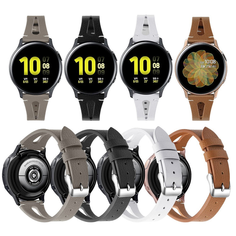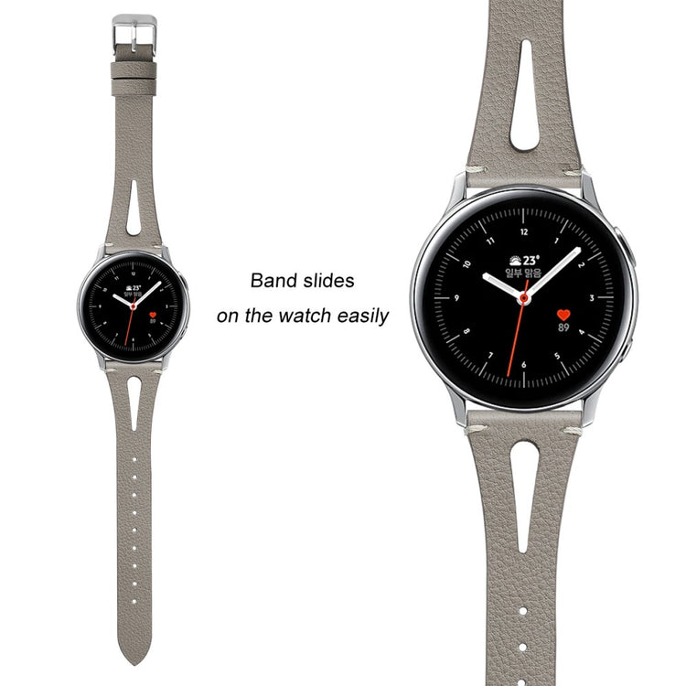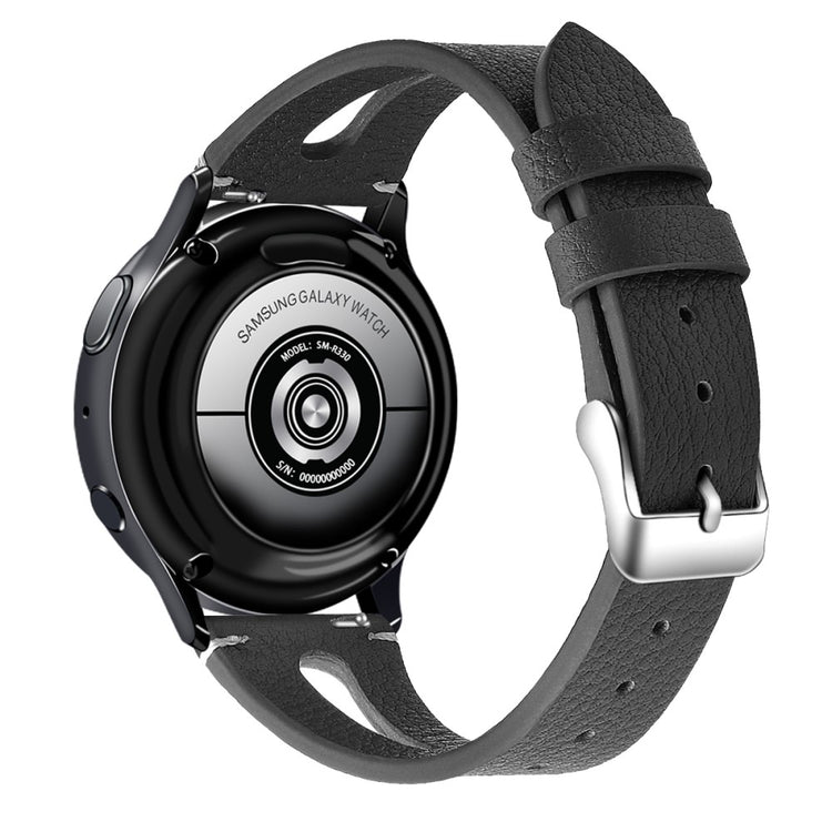 Dette er et mykt og lett klokkerem av ekte lær med utskjæringer, som gjør at du nesten glemmer at du har det på deg. Remmen kan enkelt justeres for å tilpasses individuelle håndleddsstørrelser, og fungerer perfekt som en erstatning for en gammel eller ødelagt rem. Den er kompatibel med flere modeller som Samsung Galaxy Watch Active og Gear S2, samt andre smartklokker med standard 20 mm fester.