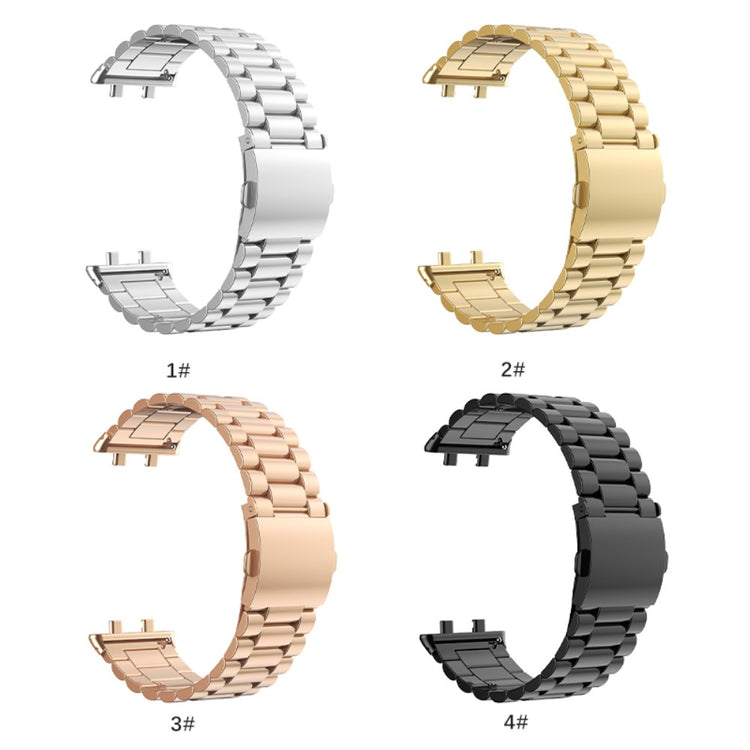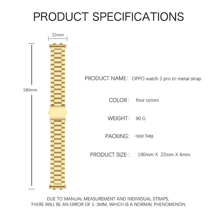 Oppgrader stilen din med et bånd til din smartwatch! Dette erstatningsremmen til Oppo Watch 3 er laget av høyverdig metallmateriale, noe som gir både luksus og slitestyrke. Den utmerkede håndverket sørger for at hver detalj er nøye vurdert, noe som gir et design med både estetikk og funksjonalitet. Du kan enkelt justere størrelsen på remmen for å passe perfekt til ditt håndledd, enten du trenger å forkorte eller forlenge den. Det unike designet med et dobbel trykknappsystem gir ekstra beskyttelse til klokkeslettet ditt, mer sikkert enn mange andre låser. Klippet gir en fin kombinasjon av eleganse og bekvemmelighet, perfekt for enhver anledning – enten det er på en dat og møter, festligheter, eller andre sosiale sammenkomster. Med en størrelse som passer håndleddsomkrets fra 160-220mm, er denne remmen ideell for både arbeid og fritid. Gjør et stilfullt valg med et bånd som kombinerer funksjonalitet og mote på en perfekt måte!