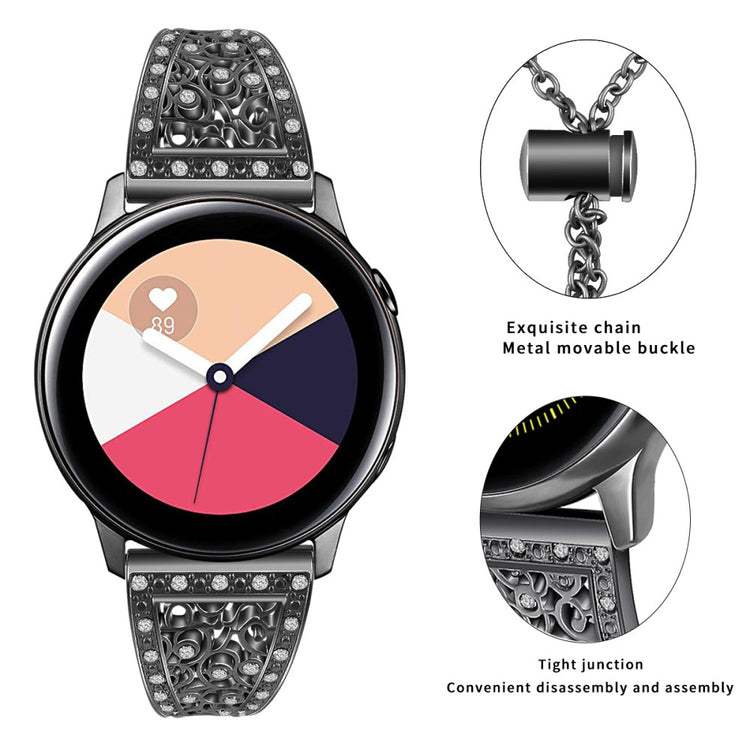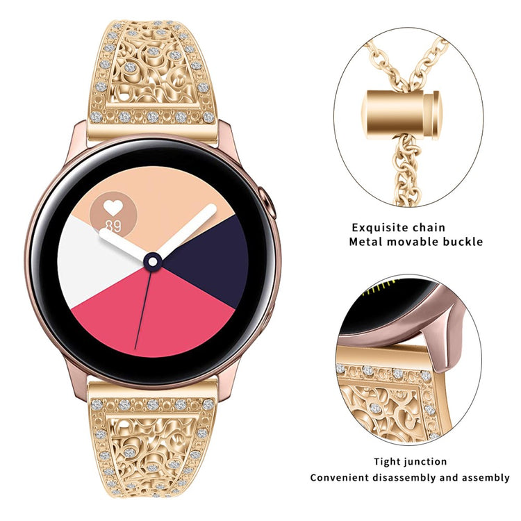 Oppgrader stilen din med denne stilige toppkvalitets armbåndet for smartklokker laget av premium sinklegering. Det elegante designet med blomsterhullmønster og glitrende rhinestone-dekorasjoner gir et elegant preg som passer perfekt til enhver anledning, enten det er på jobb eller i fritiden. Den smidige og komfortable følelsen av armbåndet gjør det behagelig å bruke hele dagen. Med det smarte kjede-movbare låsemekanismen kan du enkelt justere størrelsen uten behov for verktøy, slik at du får en perfekt passform. Dette armbåndet er også en flott erstatning for ditt ødelagte eller ubrukelige armbånd. Det er kompatibelt med flere populære modeller som Samsung Galaxy Watch3, Huawei Watch GT, og mange flere smartklokker med standard 22mm bredde. Opplev en kombinasjon av funksjonalitet og stil med dette flotte armbåndet!