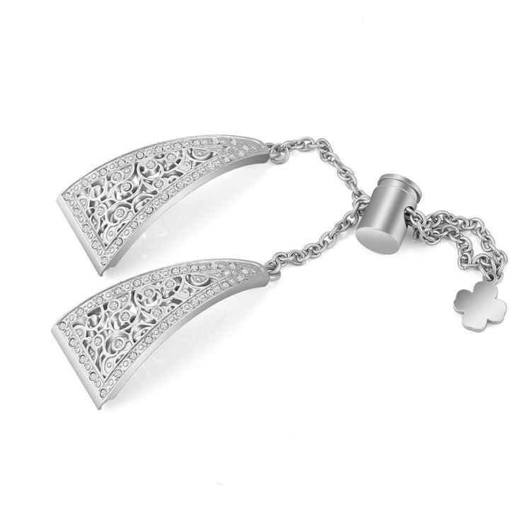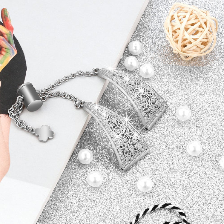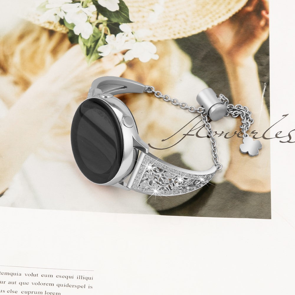 Oppgrader smartklokken din med denne elegante og komfortable klokkereimen i premium sinklegering. Den blomstrete, hule designen med glitrende rhinestones gir et sofistikert preg og passer perfekt til ethvert smykke. Med den bevegelige metallspennen kan du enkelt justere størrelsen på reimen uten behov for verktøy.