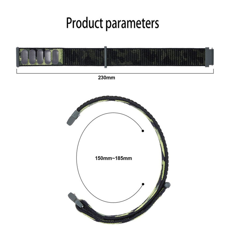 Oppgrader din smartklokke med vårt justerbare nylonarmbånd for Samsung Galaxy Watch 3 45mm og Huawei Watch GT3 Pro 46mm. Dette armåndet er laget av pustende og komfortabelt nylonmateriale, noe som gjør det perfekt for daglig bruk og trening. Den moderne kamuflasjedesignen gir et sporty og stilfullt utseende, og du kan enkelt justere størrelsen for en perfekt passform. Det er en ideell erstatning for ditt gamle, ødelagte armbånd, og sørger for at klokken din ser bra ut samtidig som den er behagelig å ha på seg. Med en omkrets som passer til håndleddet mellom 150mm og 185mm, er dette armbåndet kompatibelt med et bredt utvalg av smartklokker. Velg vårt armånd for en praktisk og stilren oppgradering av din smartklokke!