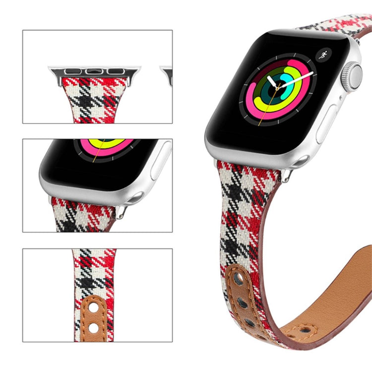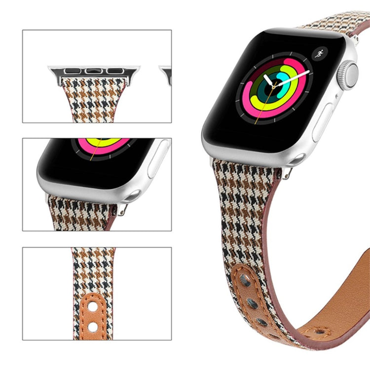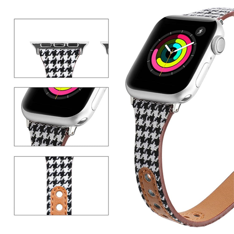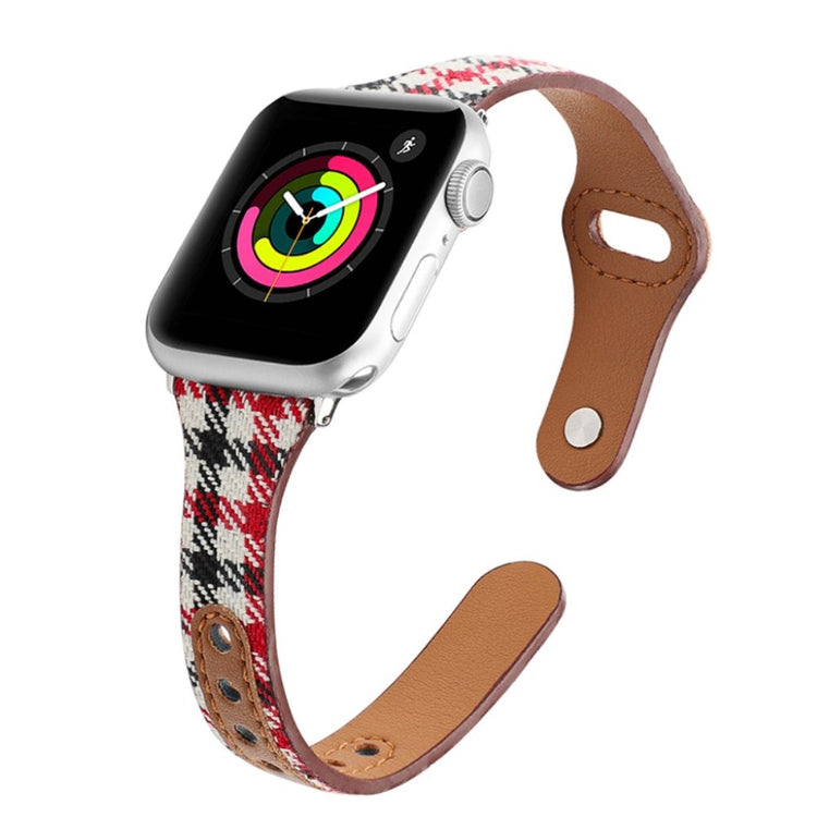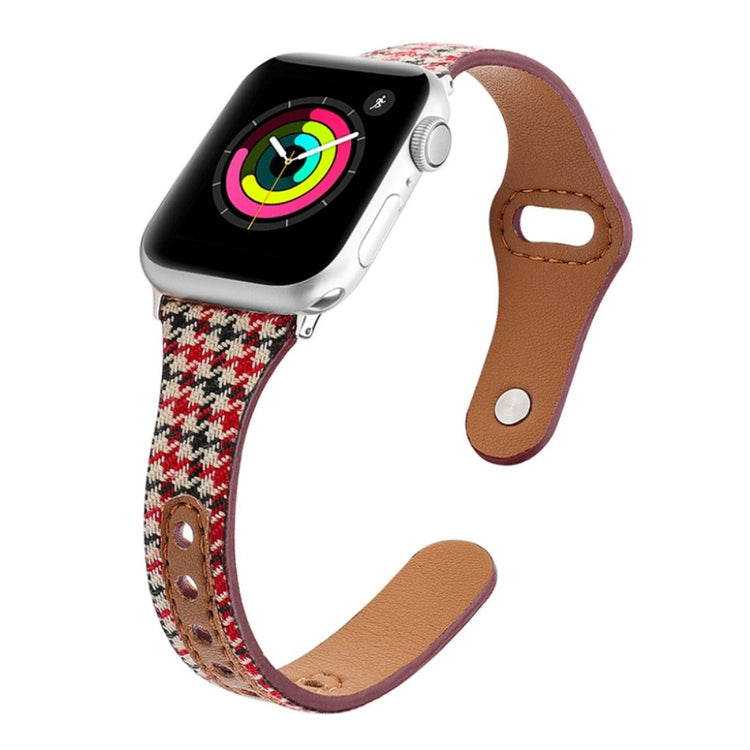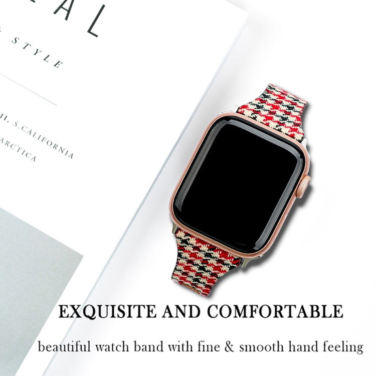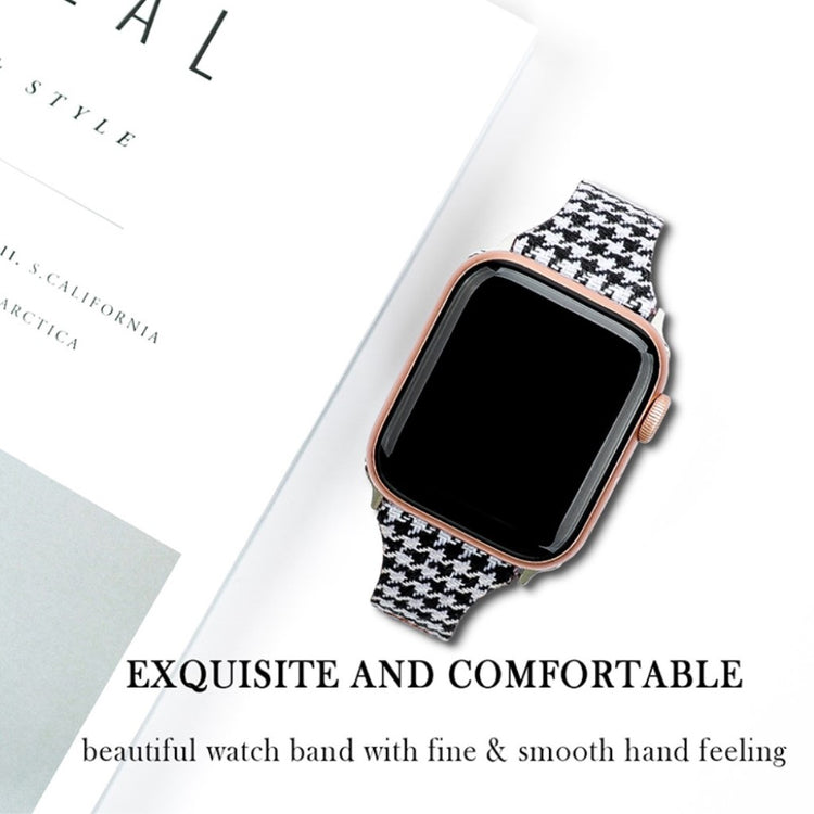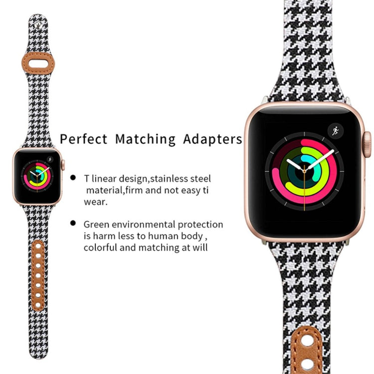 Oppgrader klokkehalset ditt med dette slanke stoff- og PU-lærsveiset urremmet, perfekt for Apple Watch-seriene. Det er laget av høy kvalitet PU-lær, er komfortabelt å bære, og har et metallspenne for enkel på- og avtakning. Med justerbare hull kan du tilpasse remmen til håndleddet ditt, noe som gjør det til et ideelt erstatningsrem for din gamle og ødelagte rem.