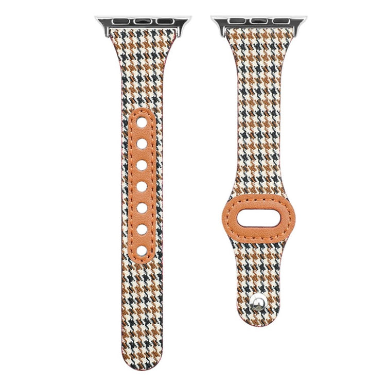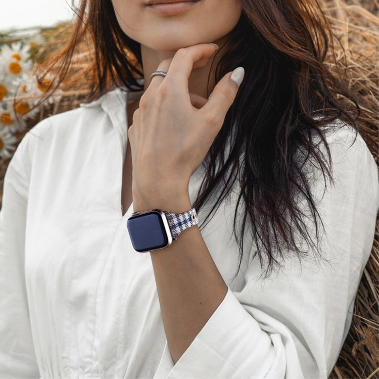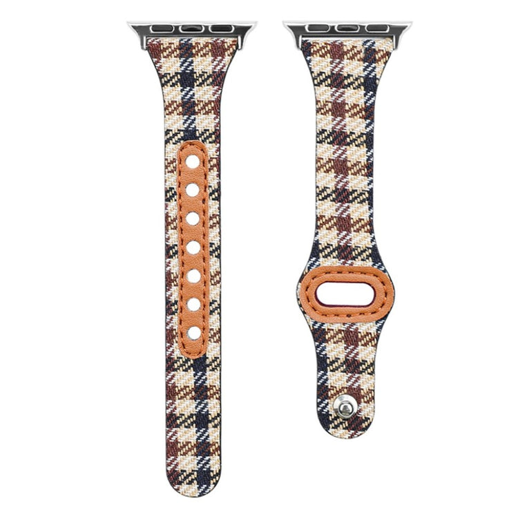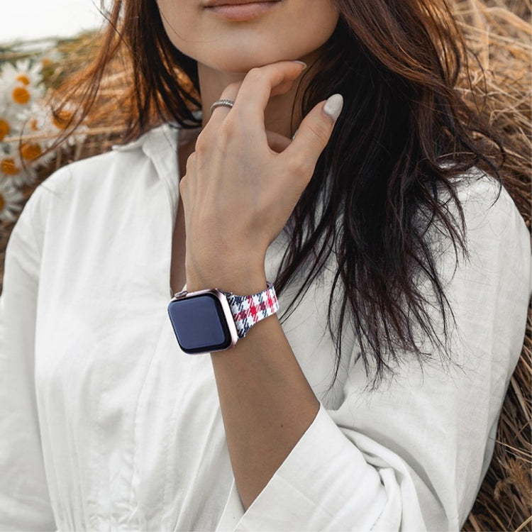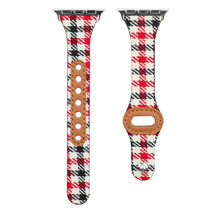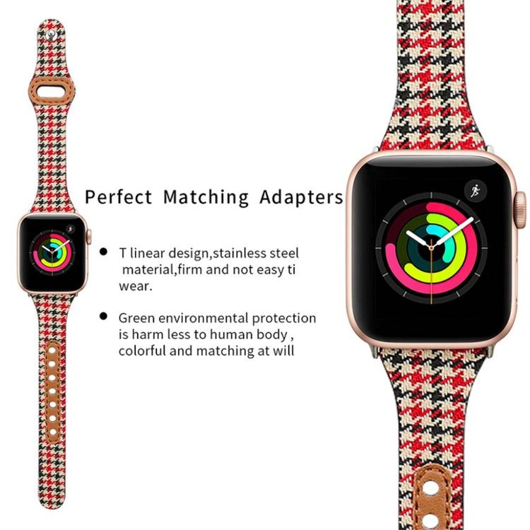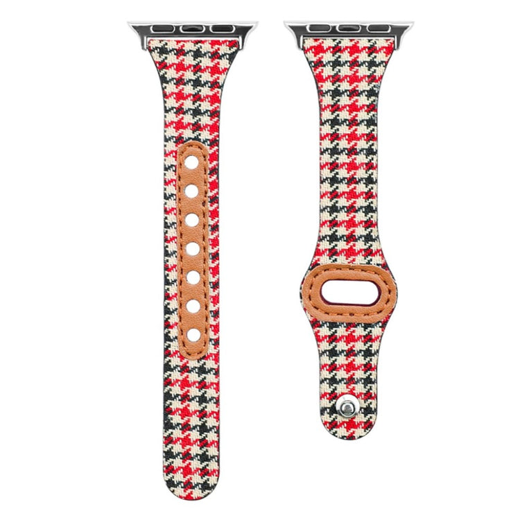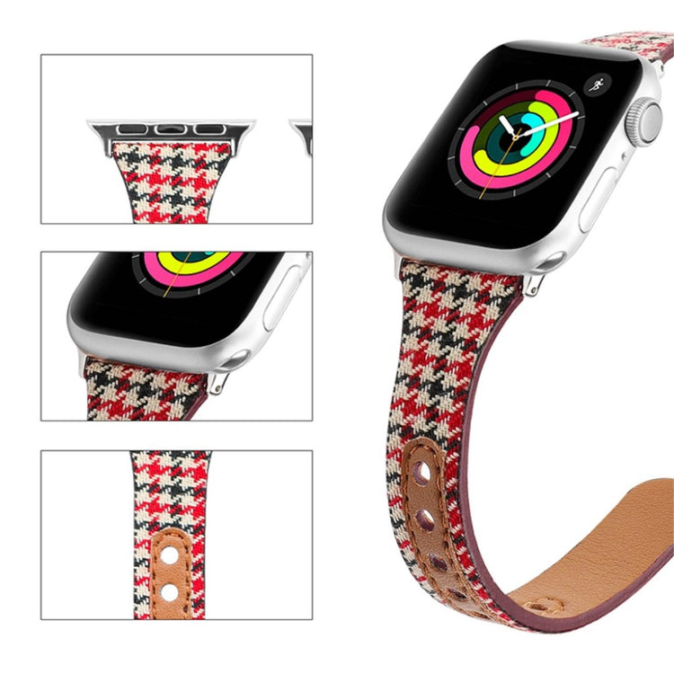 Oppgrader klokkehalset ditt med dette slanke stoff- og PU-lærsveiset urremmet, perfekt for Apple Watch-seriene. Det er laget av høy kvalitet PU-lær, er komfortabelt å bære, og har et metallspenne for enkel på- og avtakning. Med justerbare hull kan du tilpasse remmen til håndleddet ditt, noe som gjør det til et ideelt erstatningsrem for din gamle og ødelagte rem.