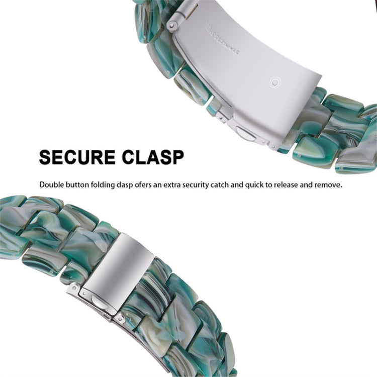 Reimen kombinerer et elegant resin-armbånd med en foldespenne i rustfritt stål med dobbel trykknapp-sikkerhetslås. Det tre-leddede designet sammen med adaptere i rustfritt stål gjør det enkelt å ta av og på reimen.