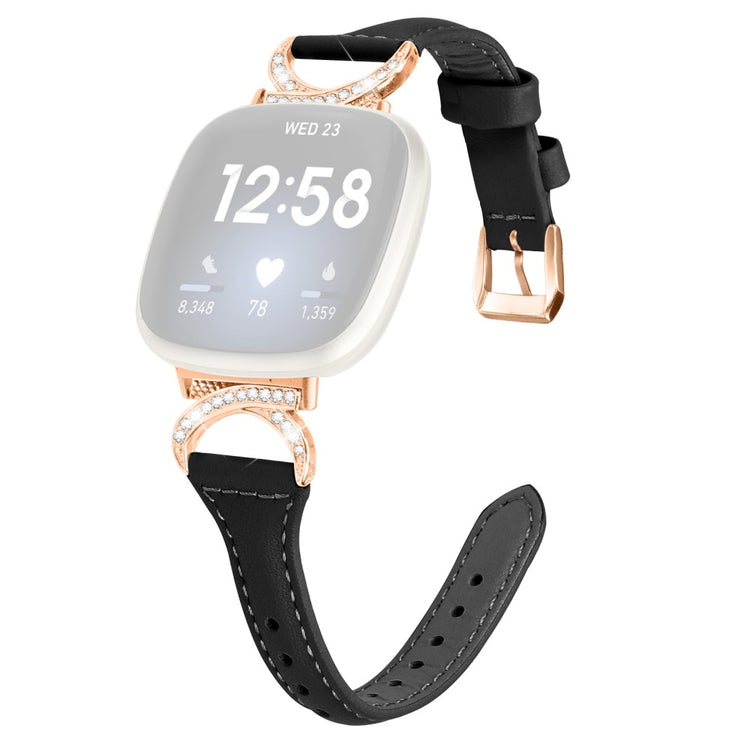 Oppgrader stilen din med dette ekte kuhudskinn armbandet til Fitbit Versa 3 / Versa 4 / Sense / Sense 2. Laget av høy-kvalitets ekte kuhud gir det en komfortabel passform som er enkel å matche med dine daglige antrekk. Den elegante formen og de glitrende rhinestones gjør at smartklokken din ser mer vakker og stilig ut. Armbandet har et flere-hull design, noe som gjør det enkelt å justere størrelsen til din håndledd. Den slitesterke rustfrie stålen på spennen sikrer at armbandet er holdbart og tåler daglig bruk. Enten du er på jobb, i fritiden eller til andre daglige anledninger, er dette det perfekte erstatningsbåndet for ditt gamle eller ødelagte armbånd.