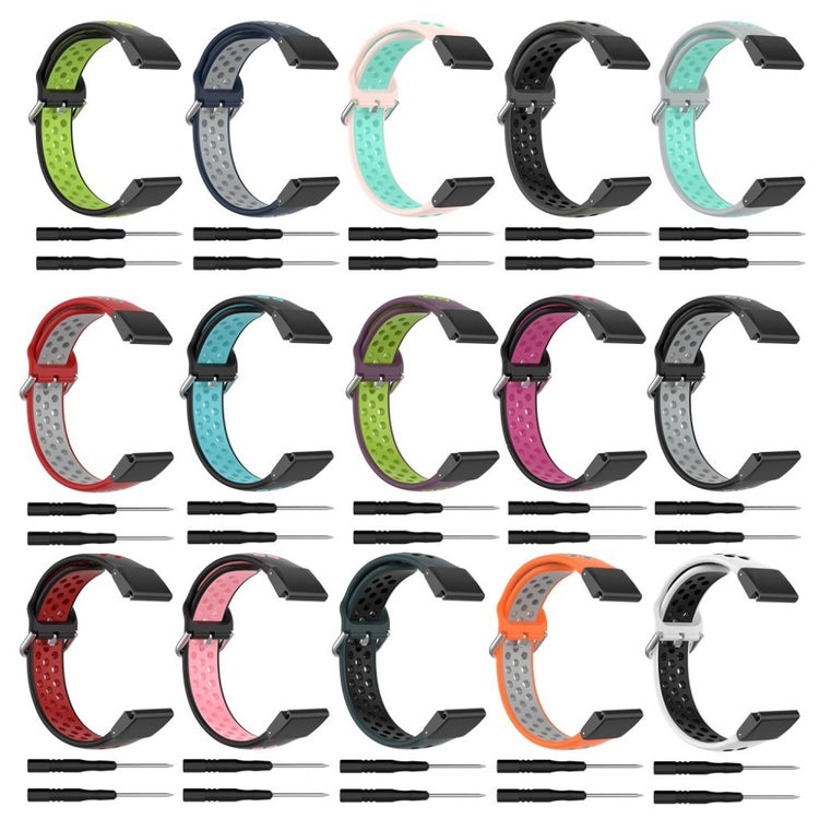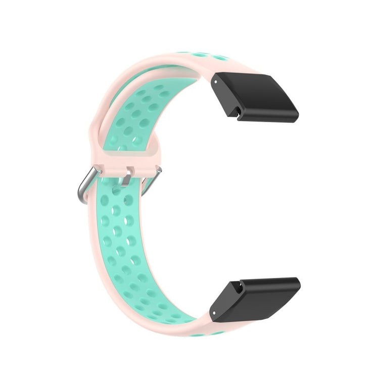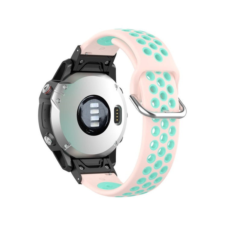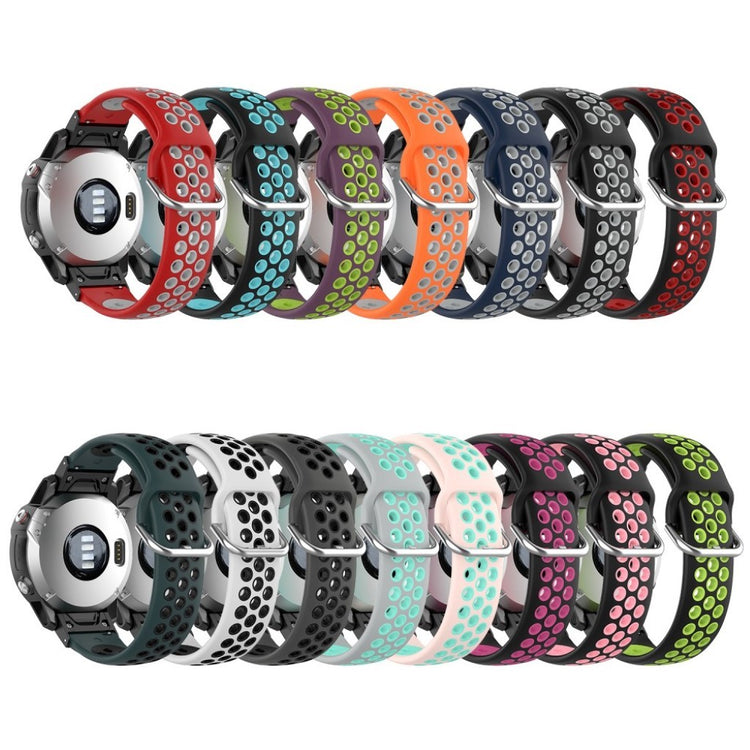 Oppgrader din smartklokke med dette stilige 22mm bi-farget silikonremmen, spesialdesignet for Garmin Fenix 5/6/7/GPS/6 Pro GPS/6 Sapphire GPS/5 Plus. Remmen er laget av mykt silikonmateriale som er både komfortabelt å bruke og sikrer hurtig varmeavgivelse, noe som gjør den ideell for aktive livsstiler. Den er utviklet med hull for ventilasjon, noe som ytterligere øker komforten ved langtidsbruk. I tillegg er materialet trygt og miljøvennlig, helt uten skadelige stoffer for kroppen. Med justerbar størrelse kan remmen tilpasses den enkelte brukers håndledd, slik at du kan oppnå den perfekte passformen. Forvandle utseendet på din klokke og nyt en moderne design som passer til alle anledninger.