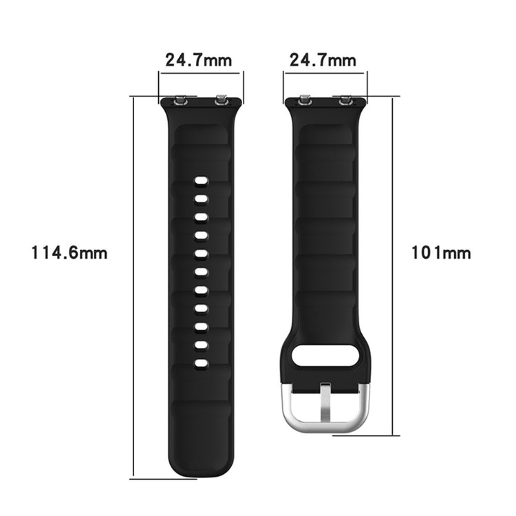 Justerbart silikonearmbånd for sportsklokker, designet for Oppo Watch 2 med en diameter på 42 mm. Laget av kvalitetssilikon, er det miljøvennlig og holdbart, med moderat mykhet for komfortabelt bruk. Armbåndet har en metallspenne for enkel påtaking og justering, samt hull for tilpasning til håndleddet.